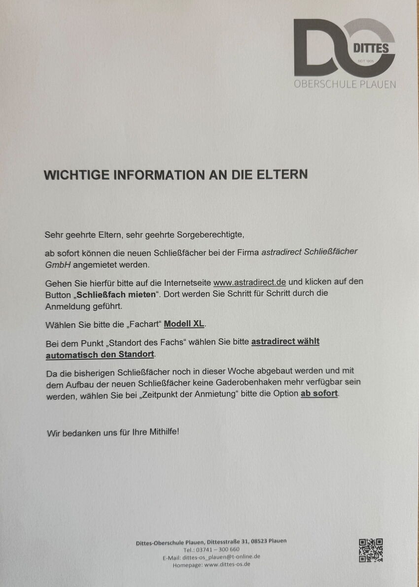 Eltern-Information: Wie bekomme ich ein neues Schließfach?